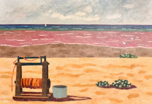 Lesley Giles (20th Century), view of a windlass on a beach, oil on canvas, 25" x 37" (63 x 94cm).