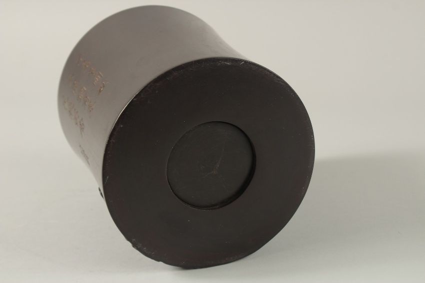 A FINE AND LARGE 18TH-19TH CENTURY HARDWOOD BITONG BRUSH POT, with finely carved relief floral decoration and incised inscription, 18cm high.