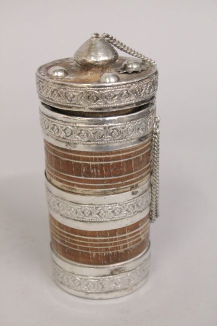 AN OMANI SILVER MOUNTED WOODEN CYLINDRICAL POWDER BOX, 16cm high.