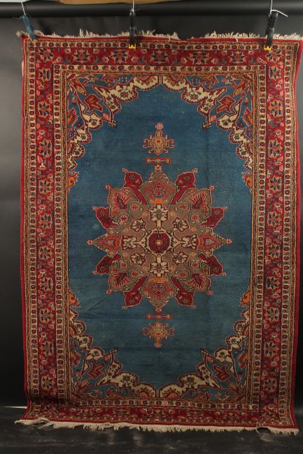 A PERSIAN BLUE GROUND AND RED DESIGN RUG, 180cm x 122cm.
