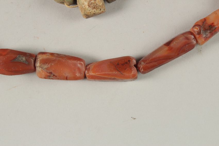 A POSSIBLY ANCIENT STRING OF AGATE BEADS, and another of blue/green faience beads, (2).