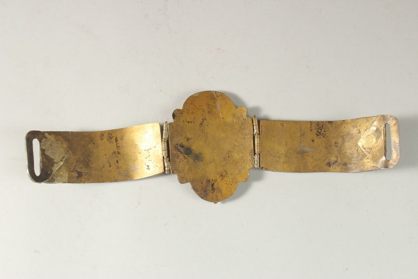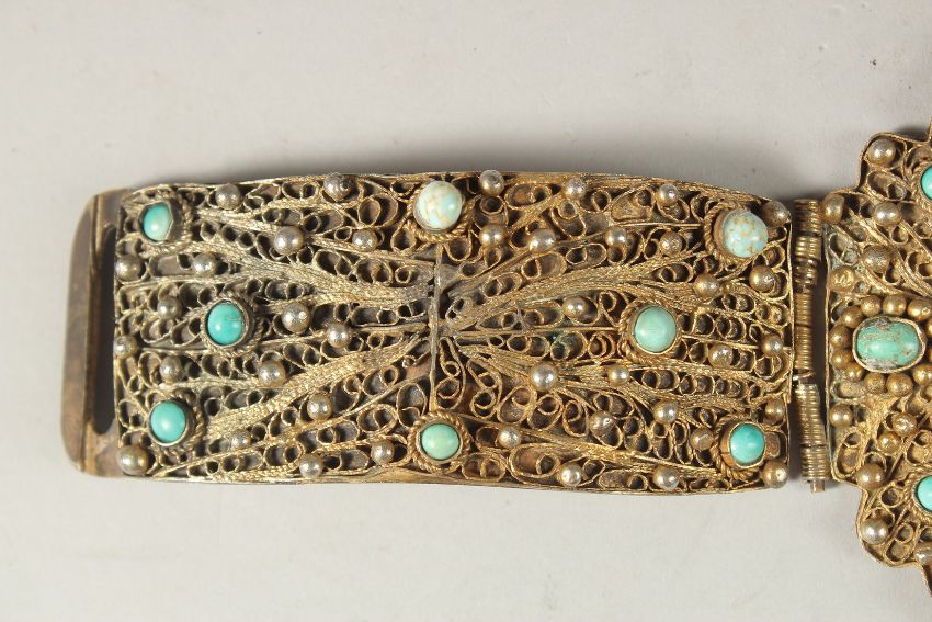 A 19TH CENTURY OTTOMAN TURQUOISE STONE INSET GILT SILVER FILIGREE DRESS ORNAMENT, 28cm long (open).