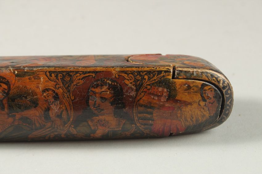 A PERSIAN QAJAR LACQUERED PAPIER MACHE QALAMDAN PEN CASE, painted with portraits, the interior with white metal inkwell, 22cm long.
