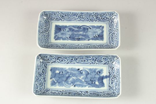 A PAIR OF 19TH CENTURY CHINESE BLUE AND WHITE PORCELAIN RECTANGULAR DISHES, 21.5cm x 11cm.