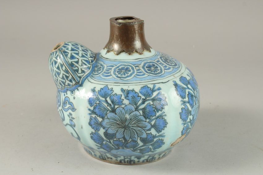 A FINE 17TH CENTURY SAFAVID PERSIAN BLUE AND WHITE KENDI, with floral panel decoration.