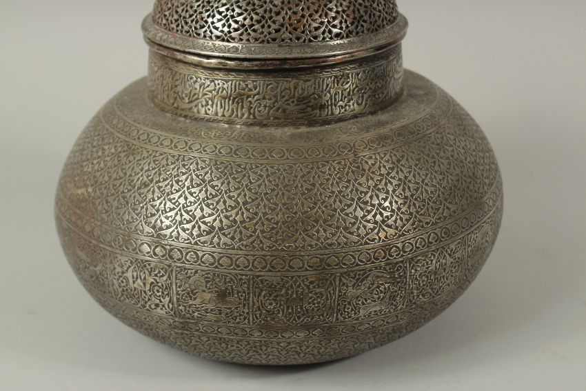 A FINE AND LARGE PERSIAN ENGRAVED AND OPENWORKED TINNED COPPER LIDDED BOWL, 30cm high.