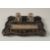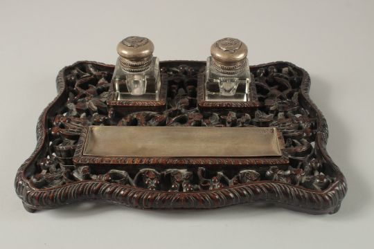 A CHINESE CARVED OPENWORKED HARDWOOD DESK STAND with two glass inkwells and brush rest, 31cm x 23cm.