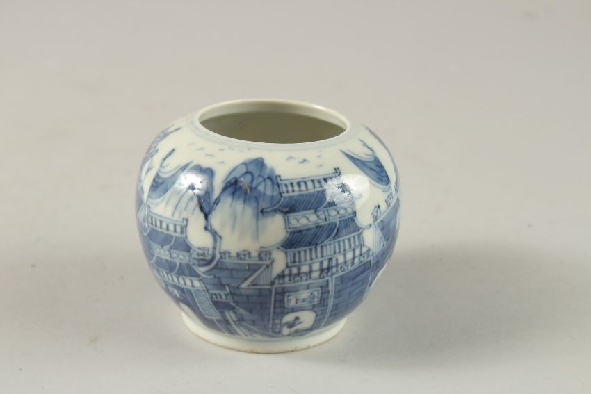 A SMALL CHINESE BLUE AND WHITE PORCELAIN BULBOUS VASE, painted with a continuous landscape scene with buildings, the base with four-character mark, 8cm high.