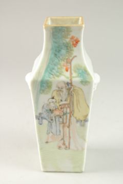A CHINESE SQUARE-FORM PORCELAIN VASE, painted with immortals and calligraphy, 21cm high.