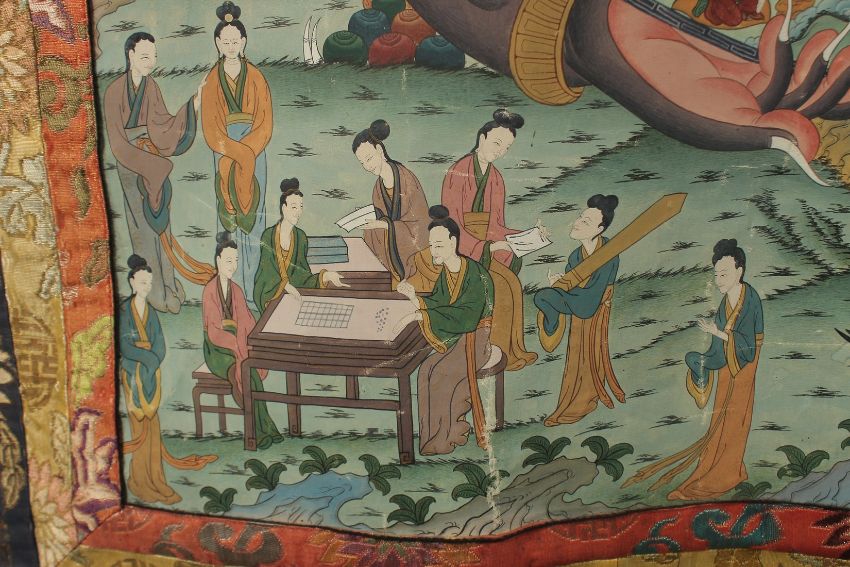 A VERY FINE AND LARGE TIBETAN 'WHEEL OF LIFE' THANGKA, beautifully painted with various deities, figures, and skeletons, laid on embroidered silk, the verso with pictorial inscription, purchased in Tibet originally hanging in a monastery - private collection, image measuring 113cm x 85cm.