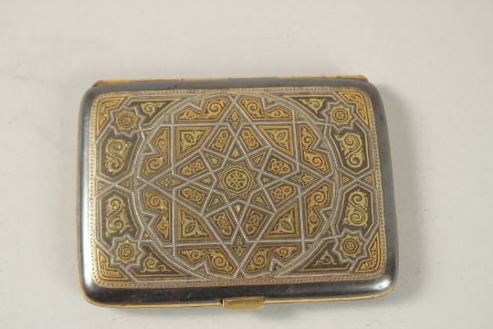A FINE TOLEDO GOLD AND SILVER INLAID CIGERETTE CASE, 9cm x 7cm.