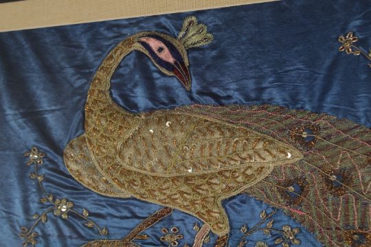A FINE PAIR OF INDIAN EMBROIDERED AND PADDED SILK PANELS, depicting peacocks and palace, framed and glazed, 107cm x 57cm.