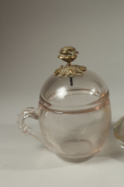 TWO 19TH CENTURY OTTOMAN MARKET GILDED GLASS HUQQA BASES, and another 19th century Ottoman Turkish lidded cup with brass flower finial, tallest 30cm high, (3).
