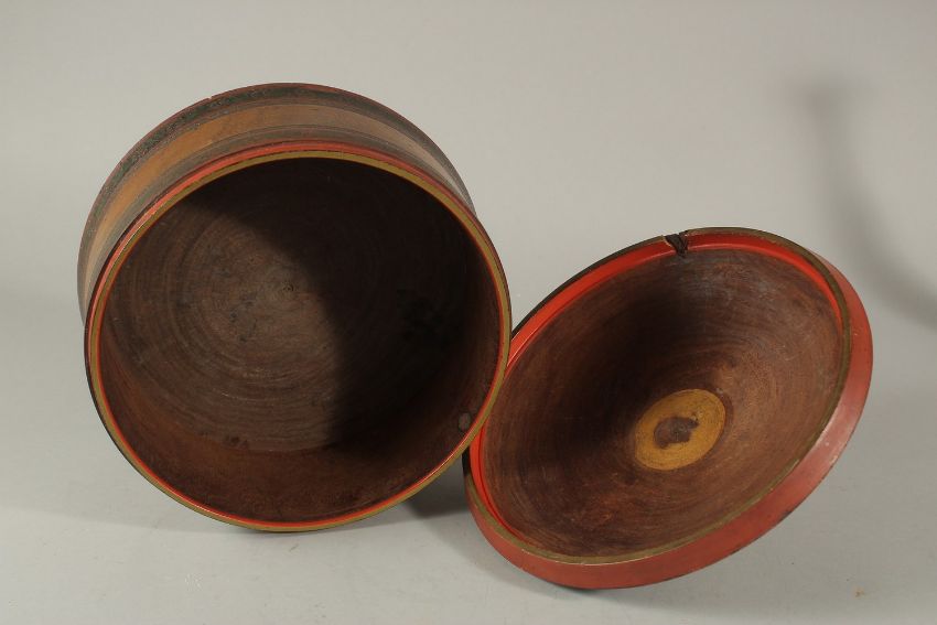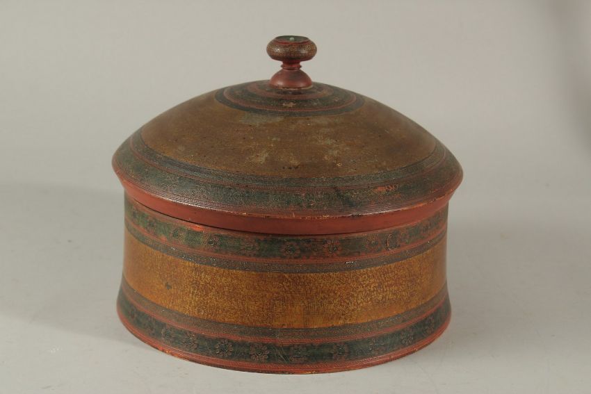 A LARGE 19TH CENTURY INDIAN LACQUERED WOODEN TURBAN BOX, 23.5cm diameter.