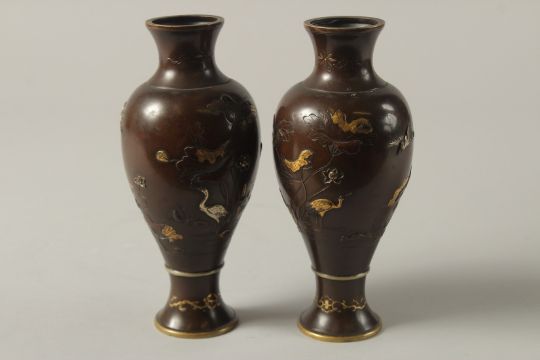 A FINE PAIR OF JAPANESE MEIJI PERIOD MIXED METAL INLAID BRONZE VASES, decorated with gilt and silver cranes and flora, each signed to base, 18cm high.