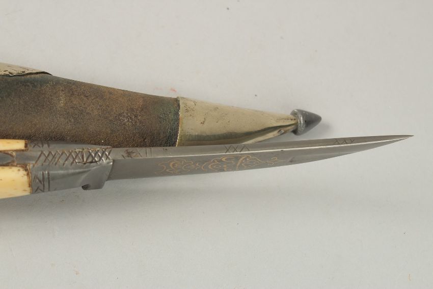 A FINE 18TH-19TH CENTURY PERSIAN WATERED STEEL BONE HILTED DAGGER, with gold inlaid calligraphy - possibly a signature to the blade, with scabbard, total length 28cm.