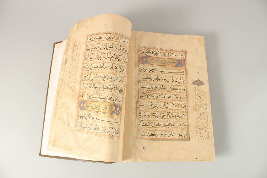A FINE AND LARGE NORTH INDIAN MUGHAL LEATHER BOUND QURAN SIGNED ABD AL-LATIF BIN MULLA, dated 1098.