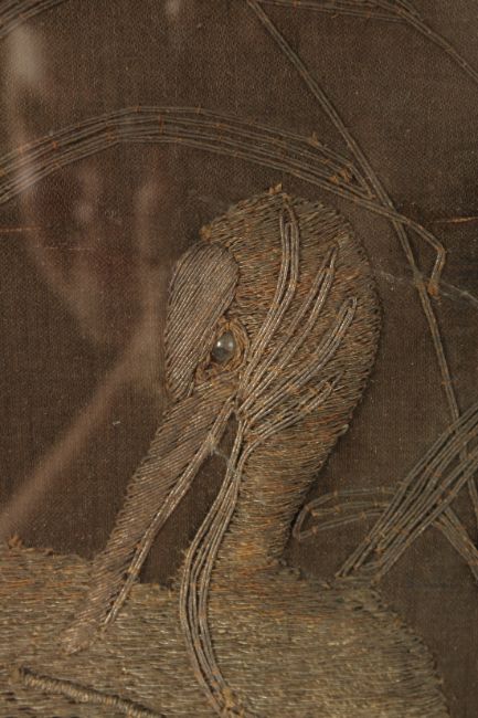 A CHINESE METAL THREAD EMBROIDERED SILK PANEL, depicting cranes, framed and glazed, 72.5cm x 49.5cm overall.