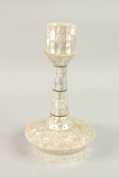 AN INDIAN GOA MOTHER OF PEARL CANDLESTICK, 29cm high.