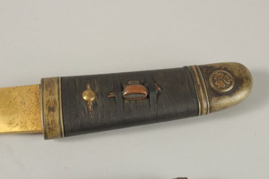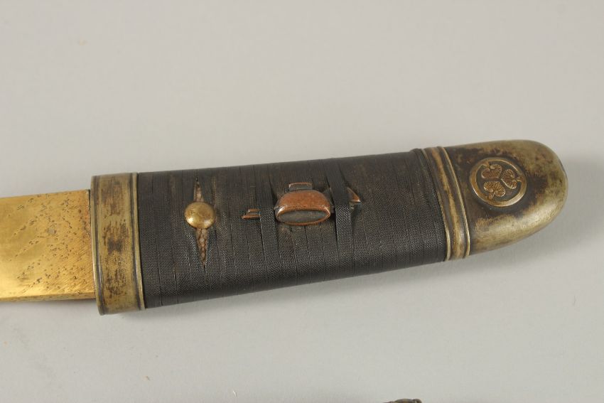 A JAPANESE MEIJI PERIOD TANTO, with mon decoration and menuki tied to handle, 46cm long overall.