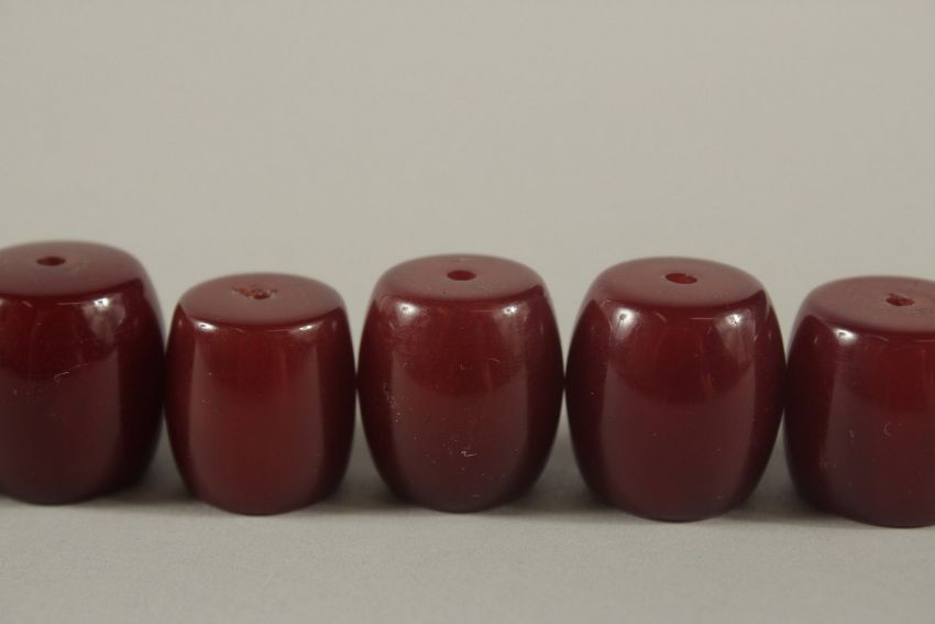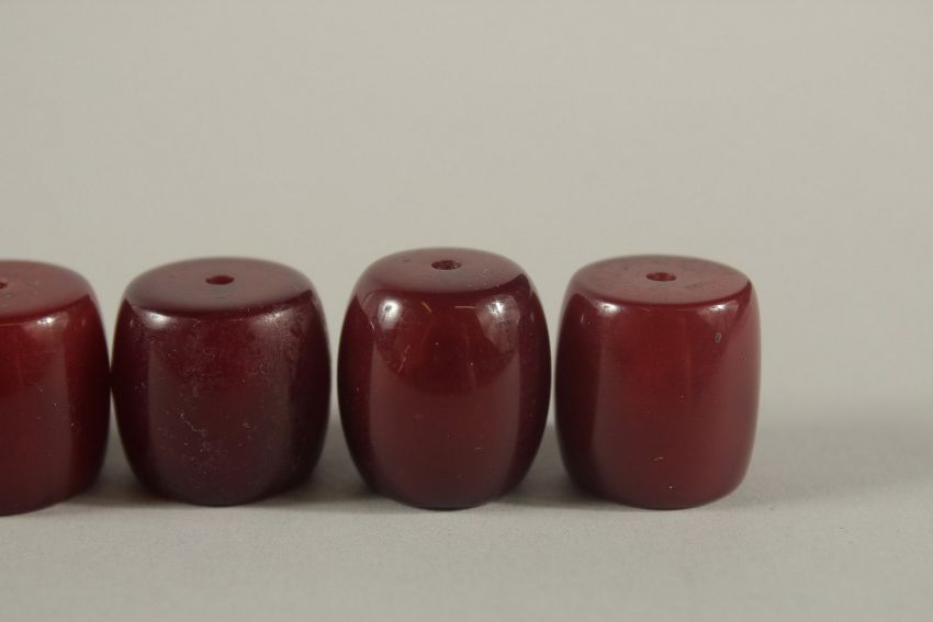 A COLLECTION OF LARGE RED BAKELITE - POSSIBLY CHERRY AMBER BARREL-SHAPED BEADS, combined weight 60g.