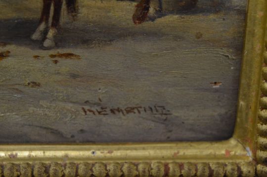 A good small oil painting on board depicting horses in a stable yard with a handler, signed.