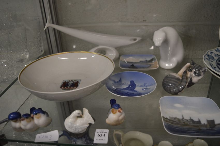 A collection of Copenhagen porcelain together with a Royal Dux polar bear and fish.