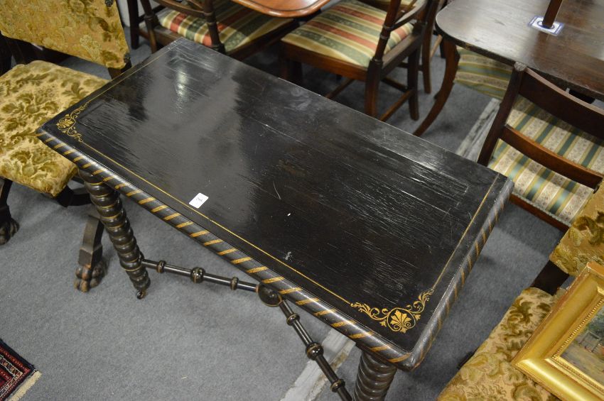 An unusual 19th century ebonised and parcel gilded rectangular fold-over card table on bobbin turned supports united by an X shaped stretcher.