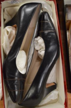 A pair of Salvatore Ferragamo black leather shoes, size 38.5, boxed.