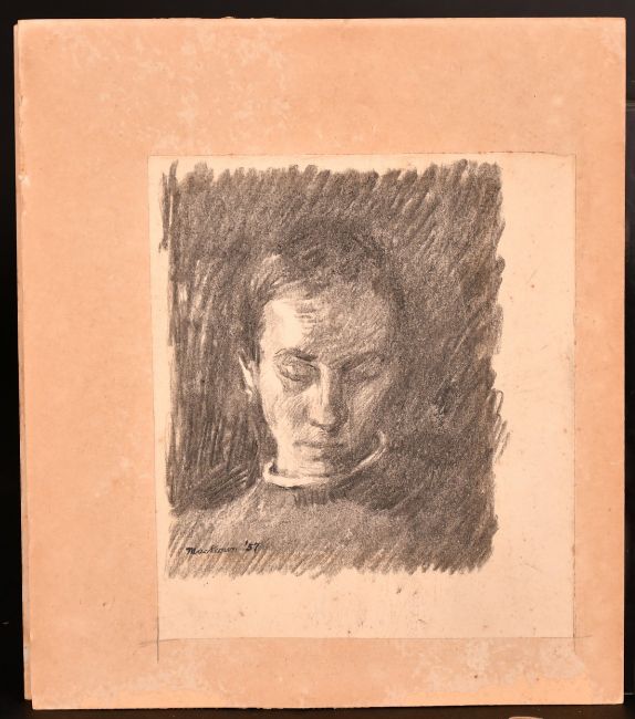 Martin Mackeown (b. 1931), a pair of pencil head studies each around 6" x 5" (15 x 12.5cm), signed and dated 57, along with a monochrome sketch of buildings by the same hand, dated June 1952, 7.25" x 10" (18.5 x 25.5cm), unframed, (3).