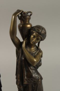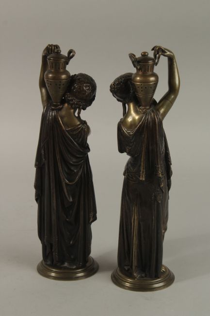A GOOD PAIR OF 19TH CENTURY FRENCH BRONZE CLASSICAL FEMALE FIGURES carrying pitchers, on circular bases.