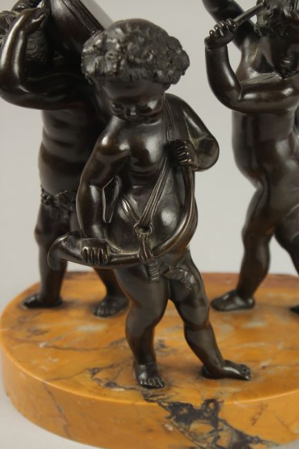 THREE BRONZE MUSICANS PUTTI on an oval marble base.