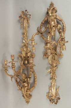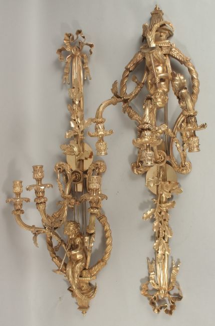 A GOOD PAIR OF LOUIS XVI STYLE GILT BRONZE CUPID THREE LIGHT WALL SCONCES with oak leaves and acorns, ribbons and acanthus.