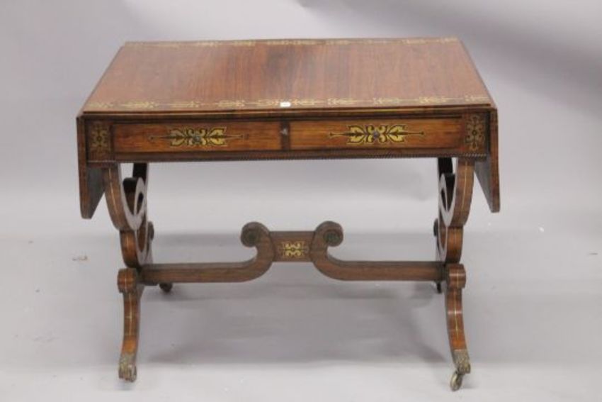 A GOOD REGENCY ROSEWOOD SOFA TABLE in the manner of GEORGE BULLOCK, with crossbanded top, brass inlay, with folding flap, one long frieze drawer, unusual end supports, curving legs ending in brass castors.