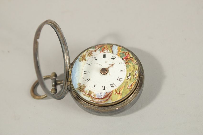 AN EARLY SILVER VERGE POCKET WATCH by Jn. Camden, London, with painted enamel dial.London 1782.