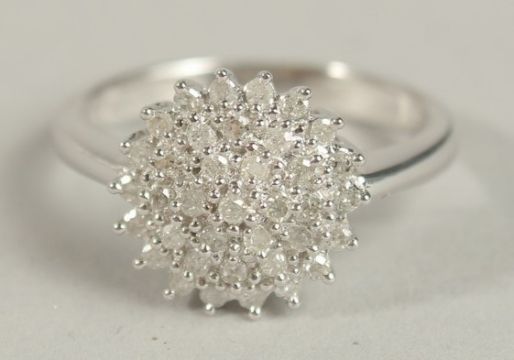 A 9CT WHITE GOLD RBC DIAMOND CLUSTER RING.