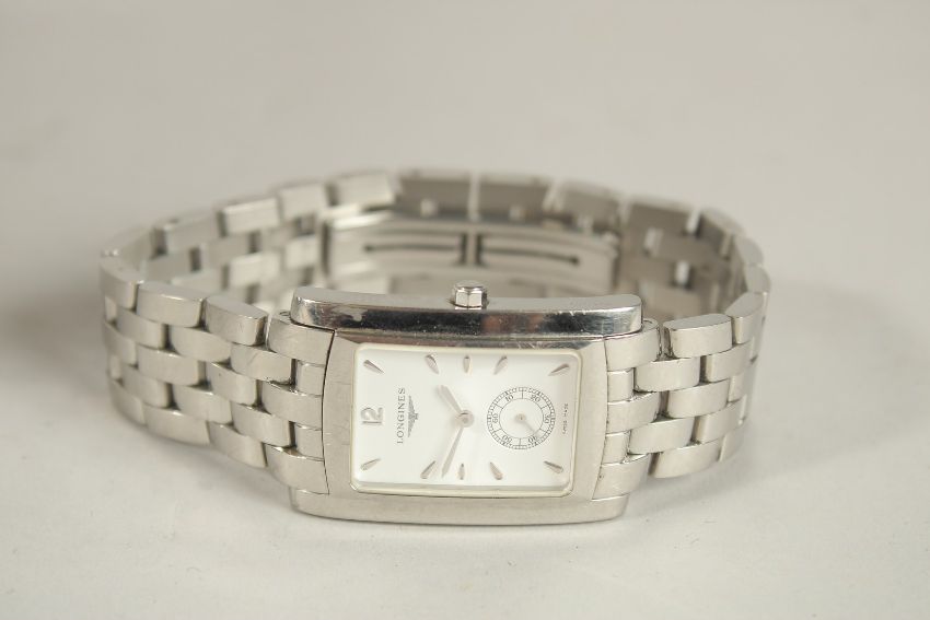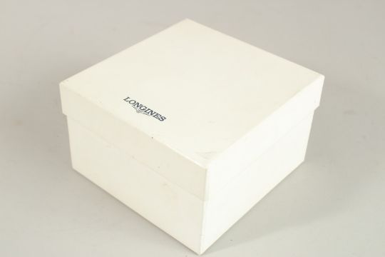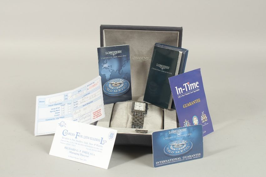 A LONGINES CHROME WRISTWATCH with papers and white box.