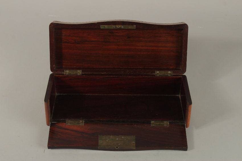 A GOOD 19TH CENTURY BRASS AND SHELL INLAID GLOVE BOX with lift up top and folding down front.