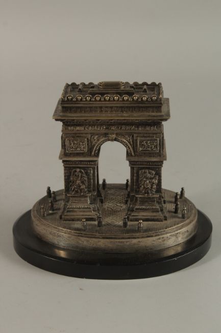 A 19TH CENTURY PLATED MODEL OF THE ARC DE TRIOMPHE, possibly by ELKINGTON & CO., on a black oval marble base.