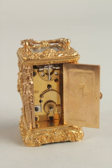 A SMALL GILT CASED CARRIAGE CLOCK.