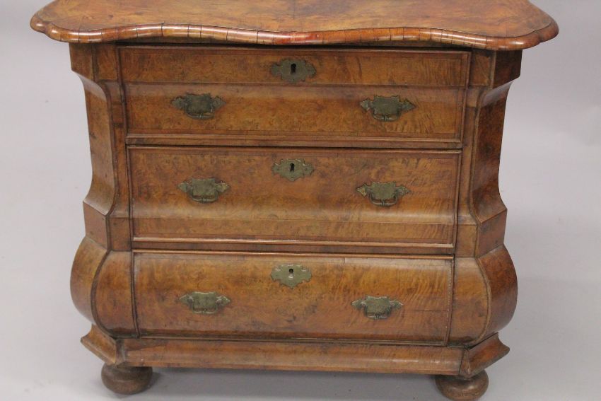 A GOOD 18TH CENTURY DUTCH WALNUT COMMODE, with crossbanded shaped top, three drawers with brass handles, on bun feet.