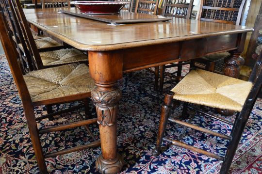 A GOOD VICTORIAN MAHOGANY PULL-OUT DINING TABLE WITH THREE LEAVES on carved and turned legs.