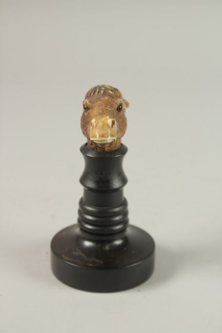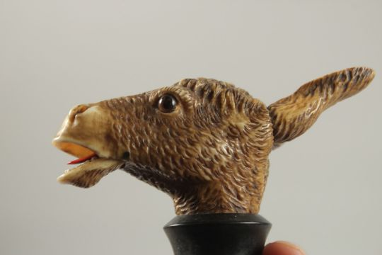 AN AMUSING SWISS CARVED BONE AUTOMATON DONKEY HEAD on a circular base. The ears and mouth move.
