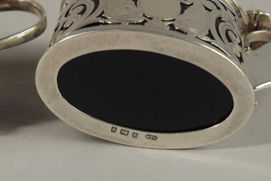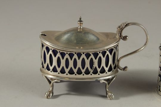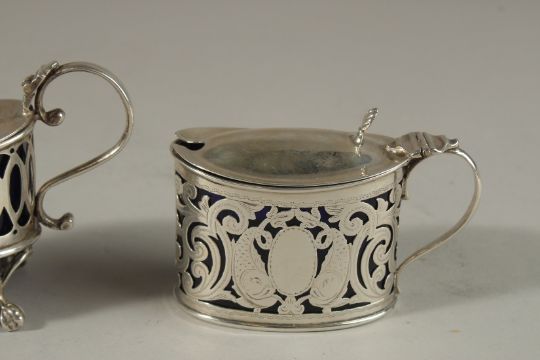 TWO PIERCED OVAL SILVER MUSTARD POTS with sapphire blue liners.