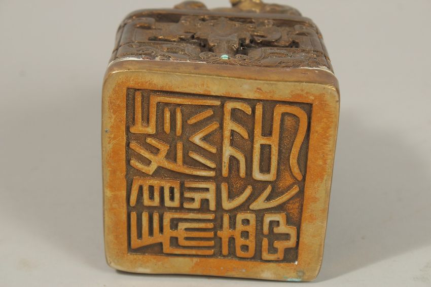 A CHINESE GILT BRONZE SQUARE DRAGON SEAL.