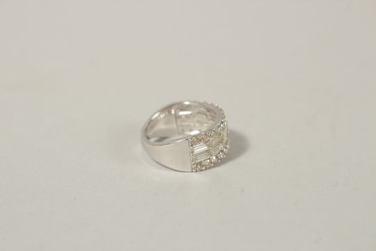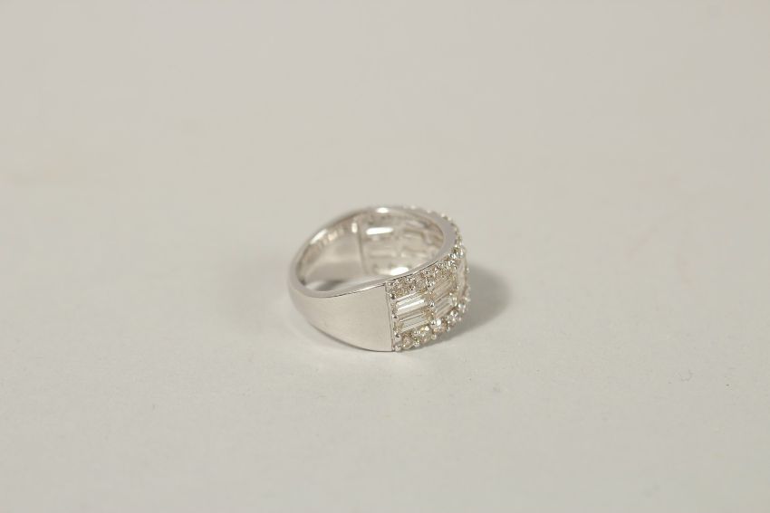A 9CT WHITE GOLD DIAMOND BAND set with RBC and baguette cut diamonds.