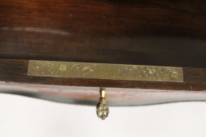 A 19TH CENTURY FRENCH BOULLE DRESSING TABLE, of serpentine outline, the rising top with mirror to the interior, supported on cabriole legs.