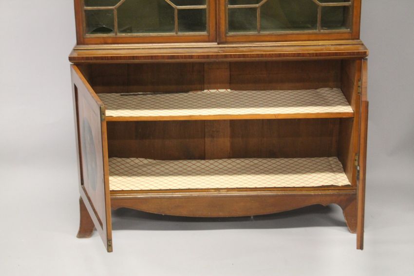 A LATE 19TH CENTURY SATINWOOD CUPBOARD BOOKCASE, with a Greek key and leaf painted cornice, the pair of astragal glazed doors enclosing two adjustable shelves over a base with a pair of cupboard doors, each with a floral painted circular panel, on splay bracket feet.