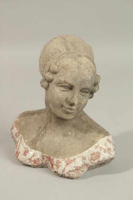 A PARTIALLY GLAZED STONEWARE HEAD AND SHOULDERS OF A YOUNG LADY.
