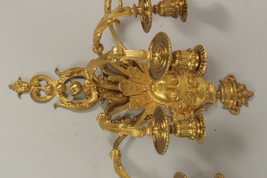 A GOOD PAIR OF LOUIS XVI FIVE-LIGHT ORMOLU WALL SCONCES with female masks and scrolls.
